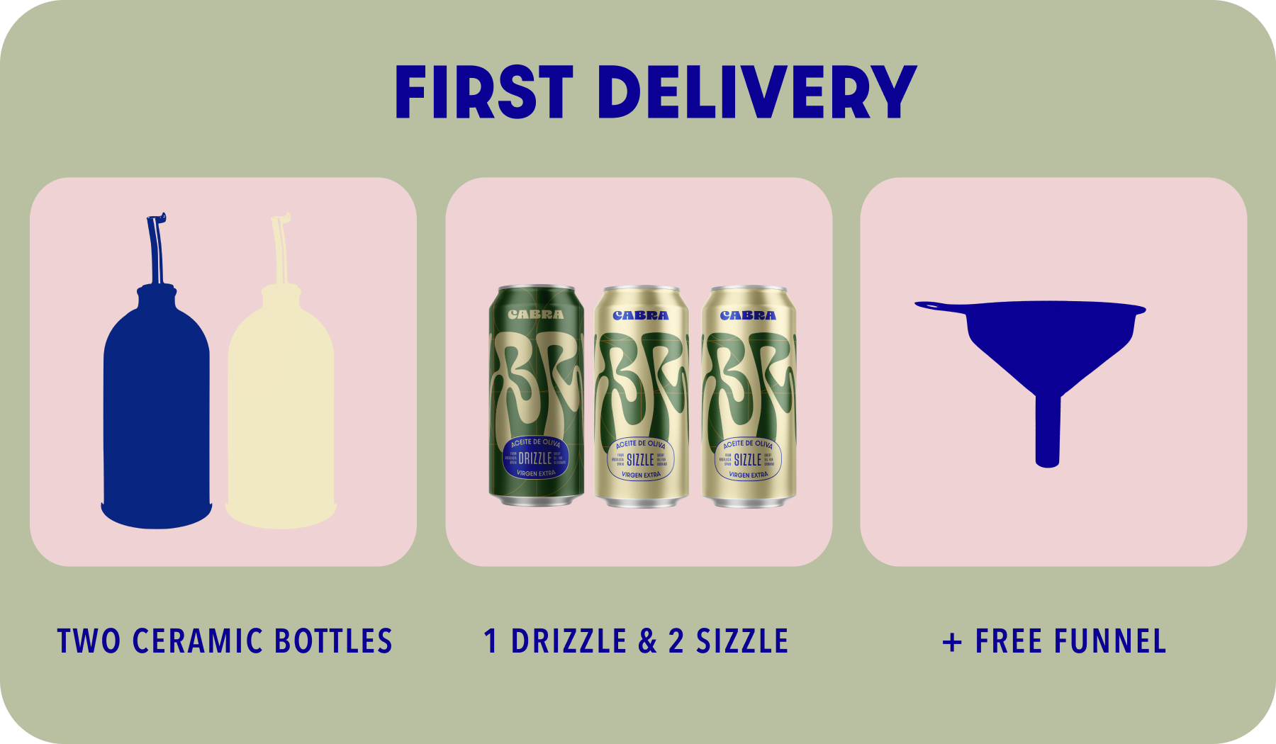 First delivery: 2 Ceramic Bottles + 1 Drizzle + 2 Sizzle + Funnel.